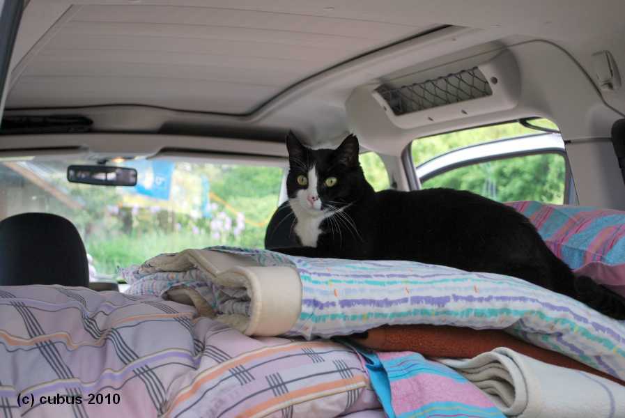 Der Wowa ist gepackt und wartet in seinem Winterstall darauf abgeholt zu werden, nur noch die Bettdecken müssen ins Auto und … STOP! Erstmal nix mit „Los“, erst musste Ihre Majestät „Her Quitschiness“ die Qualität des Bettenbergs kontrollieren. Anschließend konnten wir dann den Wowa abholen und endlich gings los.