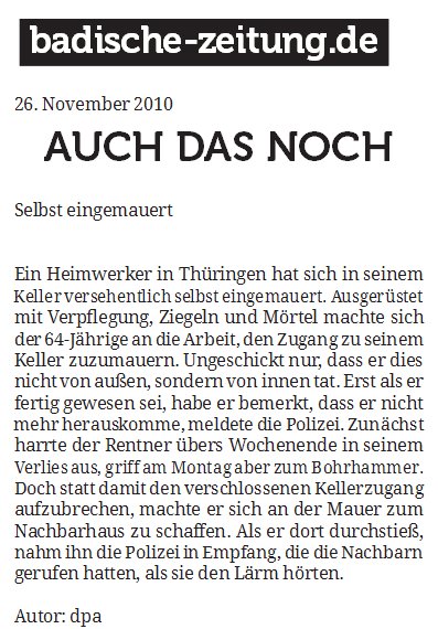 Heute morgen las ich in der Badischen Zeitung davon, dass ein 64jähriger Mann sich in seinem Keller aus Versehen selbst eingemauert habe.
