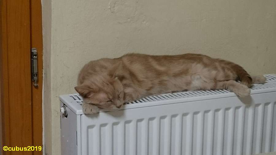 Nachdem der Winter so gut wie vorbei ist, hier noch ein Rückblick darauf, wie ein Kater im Katzenhaus des Tierschutzvereins Markgräflerland an einem kalten Wintertag sich ganz zielsicher einen zwar nicht weichen, dafür aber warmen Platz ausgesucht hat.