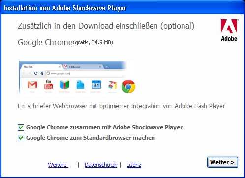 Wenn man hier die beiden Häkchen vor „Google Chrome“ nicht entfernt, wird einem nicht nur der „Adobe Shockwave Player“ installiert, sondern auch der Internet-Browser „Google Chrome“. Der schadet zwar nicht, aber ob man den haben will…